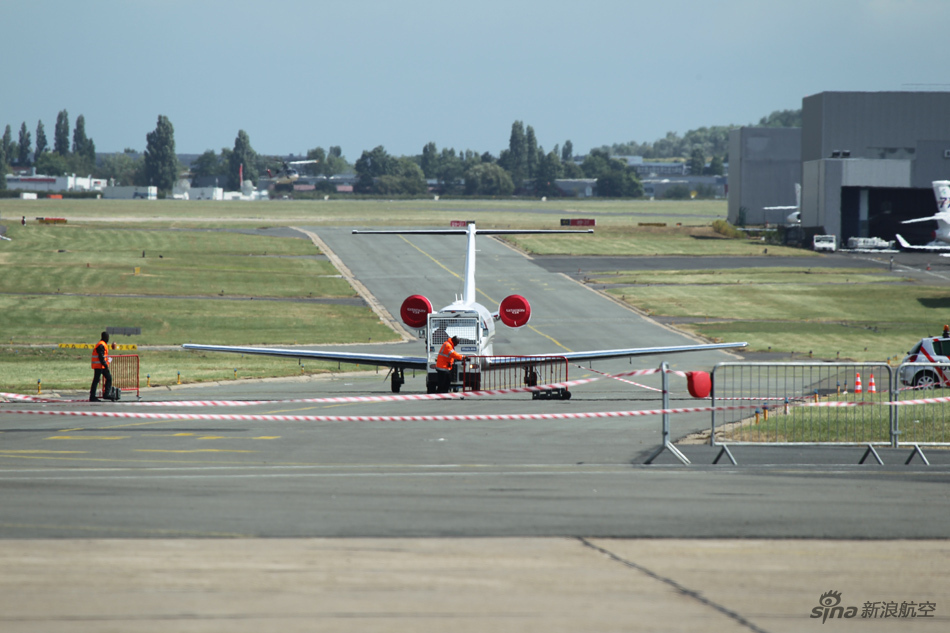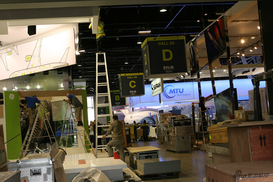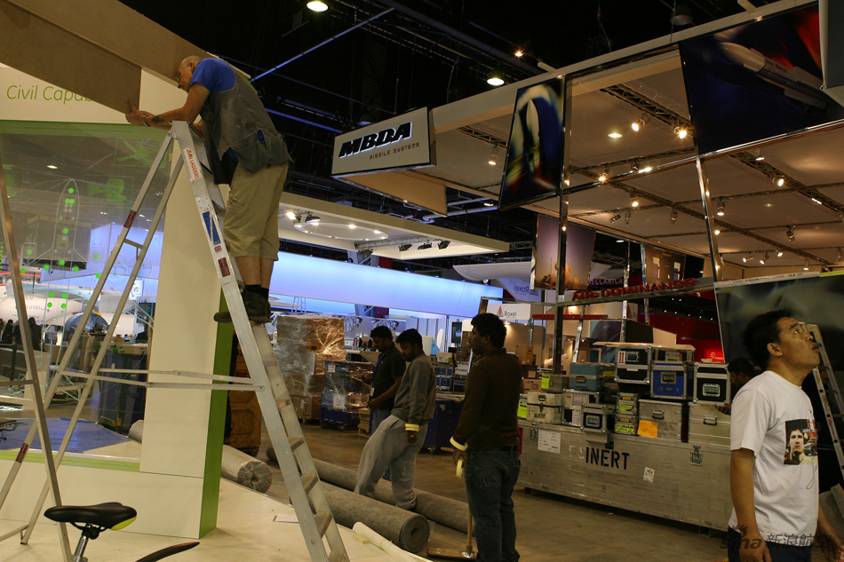 当地时间6月18日,巴黎布尔歇机场内各大参展商正在紧张的布展。停机坪上在陆续的进驻各型军民用飞机。第49届巴黎航空航天展将于6月20日开幕,本届航展有2100多家各国参展商携带大量模型实物参加。参展飞机有140多架,预计将有13.8万名业界专业参观者及20万普通参观者参观航展。 摄影:门广阔 陈诚