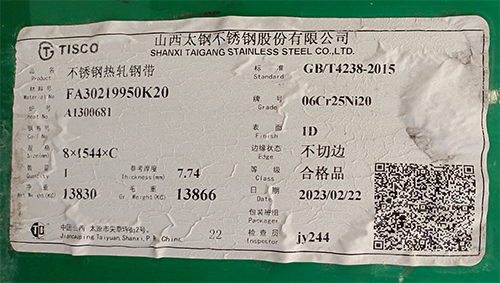规格:每个钢厂在规格信息这一项是各不相同的。一般来说,太钢标签规格是用诸如8*1544*C,表示的。其中,“8”是不锈钢热轧钢带的“标签厚度”,它区别于参考厚度;“1554”是实际宽度;“C”表示长度。